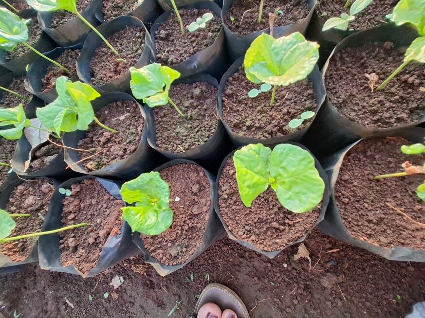 Khi hạt bắt đầu nảy mầm, chúng sẽ được gieo vào các bầu đất đã chuẩn bị sẵn. Đất ươm thường được trộn từ đất tơi xốp, phân hữu cơ hoai mục và một số thành phần giúp giữ ẩm tốt để cây con phát triển thuận lợi.